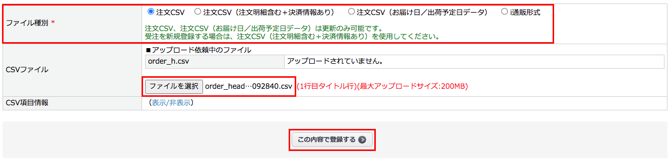 ※注文CSV、注文CSV(お届け日/出荷予定日データ)は更新のみ可能です。