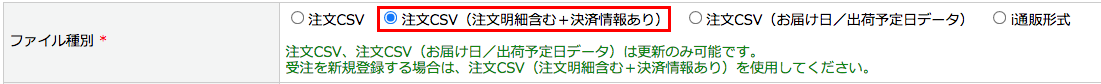 受注の新規登録時は「注文CSV(注文明細含む+決済情報あり)」をご利用ください。