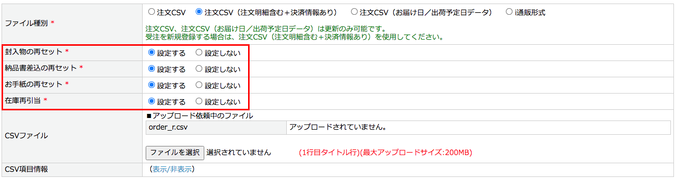 CSV登録時に「封入物」、「納品書差込」、「お手紙」の再セットと、「在庫再引当」を設定するか選択できます。