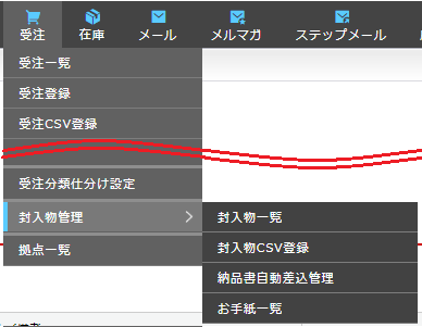 受注>封入物管理 公開日 : 2021年1月15日 / 更新日 : 2021年3月9日 受注 目次 概要 封入物、手紙、および、商品書差込の登録・管理を行います。 設定画面 受注>封入物管理 項目一覧 項目 内容 封入物一覧 封入物の登録・管理を行います。 封入物CSV登録 封入物、封入物セット内容のCSV登録を行います。 納品書自動差込管理 納品書自動差込のテンプレート登録・管理を行います。 お手紙一覧 お手紙のテンプレート登録・管理を行います。 この記事で解決しましたか? 〇 はい 0 × いいえ 0 「受注>封入物管理>封入物登録」 「受注>受注登録>注文番号の詳細」