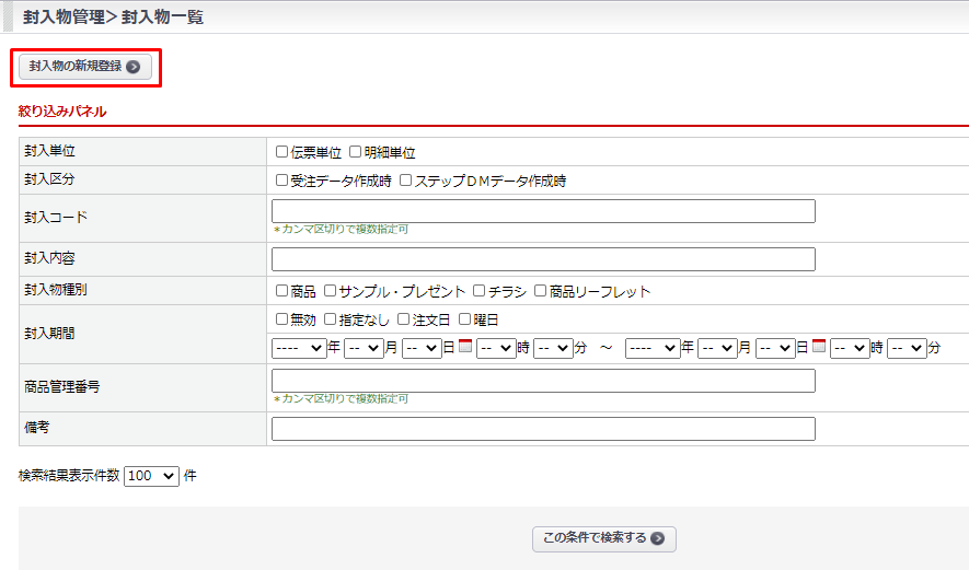 【封入物の新規登録】ボタンより封入物の封入内容、および、封入条件を登録できます。