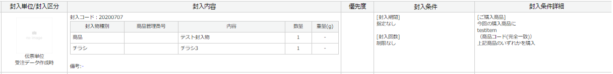 - 手動で封入物をセットした状態で新規受注登録を行った場合、自動でのセットはされません。