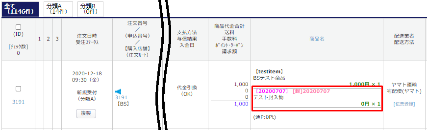 封入物種別:商品は、受注>受注一覧、および、受注登録 の画面にて