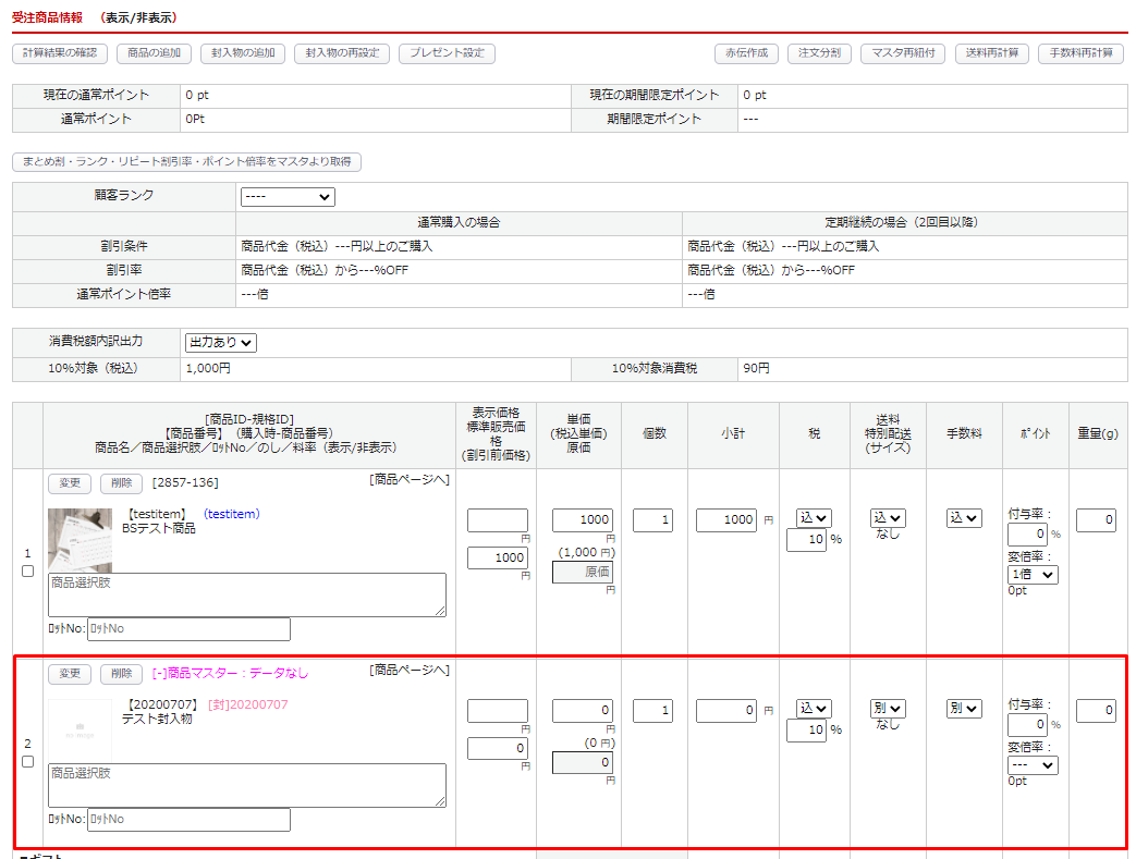 - 受注登録画面の受注商品情報に封入物が表示されます。