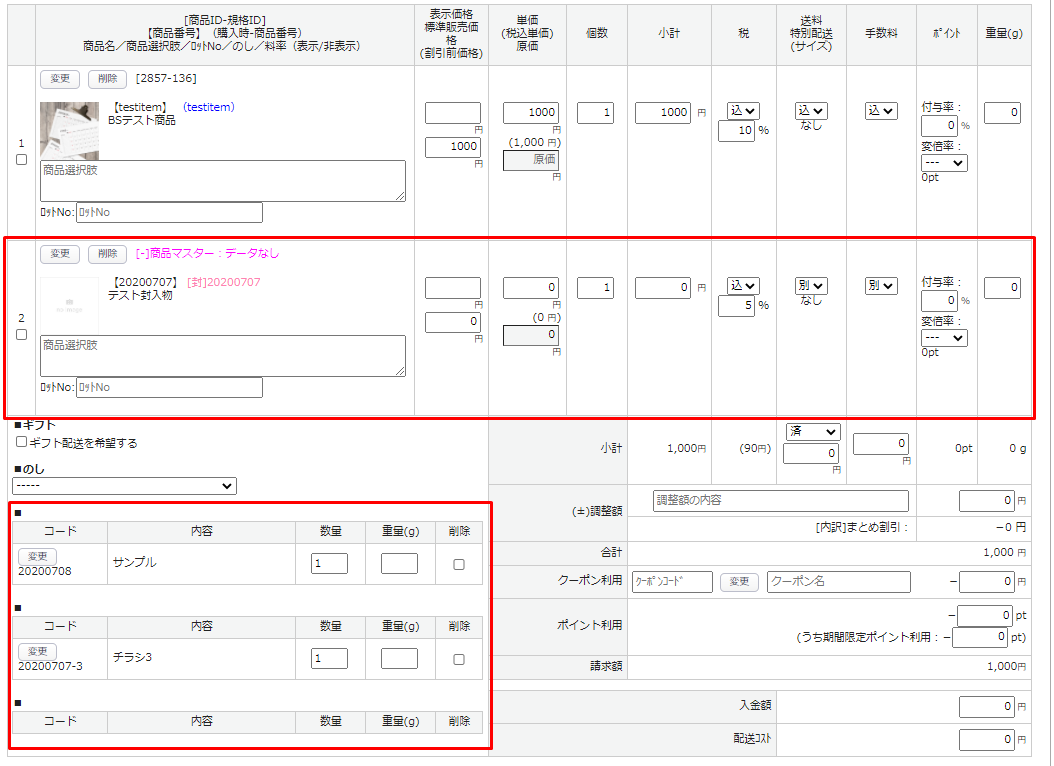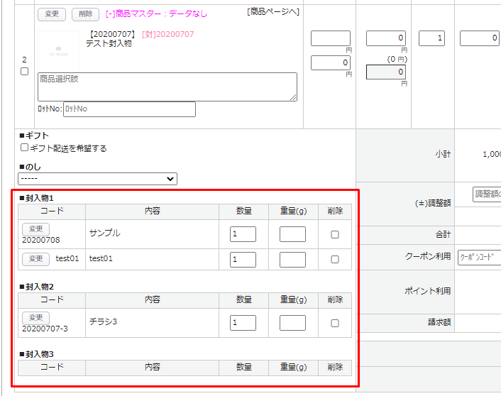 - 管理画面にて受注データ作成時に封入物が自動でセットされます。