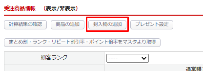 - 「受注>受注登録」にて新規受注登録時に封入物が自動でセットされます。