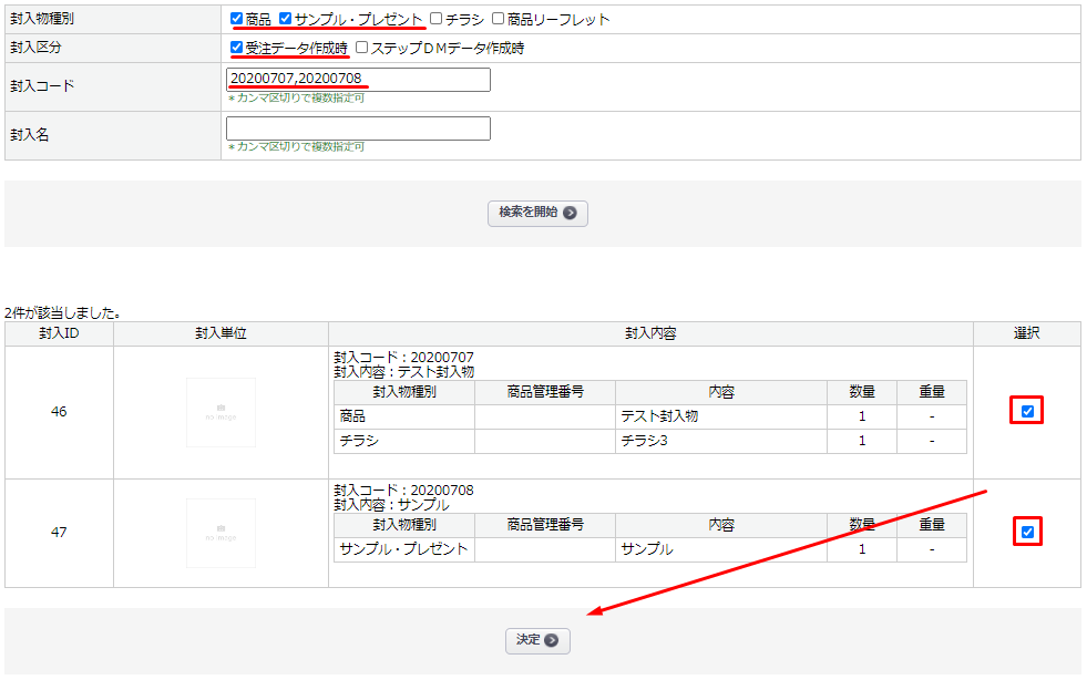 - 封入物検索画面にてセットする封入物の「選択」にチェックし、【決定】ボタンをクリックします。