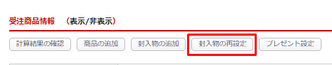 ※注文種類がDMの場合、封入物の再設定ボタンは非表示となります。