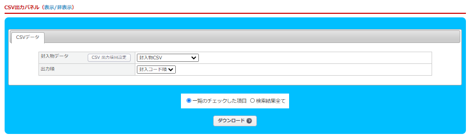 CSV出力パネルより封入物および封入物セットCSVデータをダウンロードできます。
