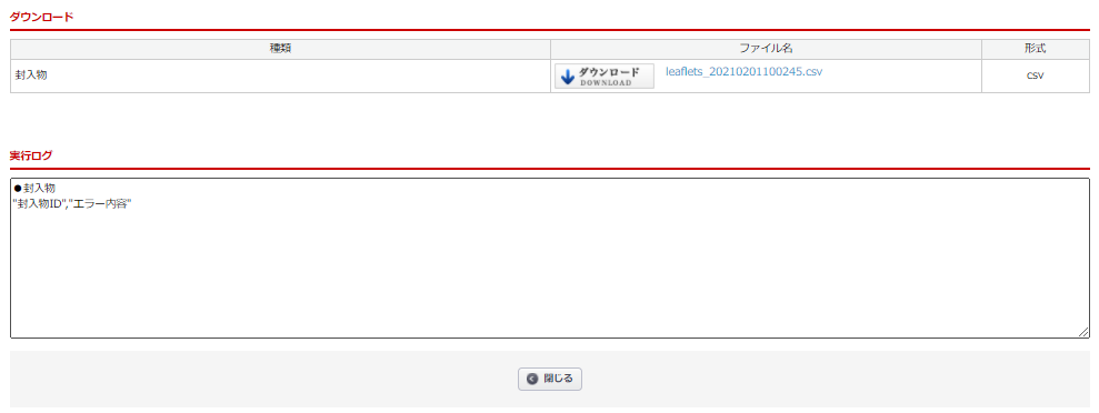 封入物データ、出力順を指定し【ダウンロード】ボタンをクリックすると実行結果画面が表示され、