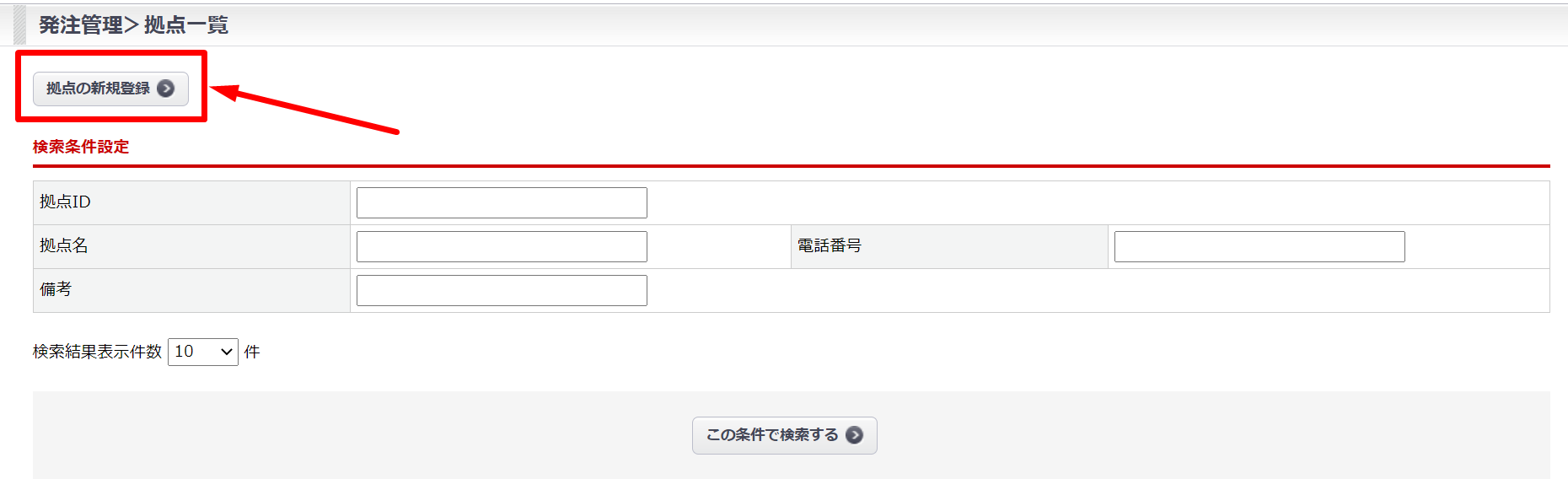 | 拠点ID | 登録された拠点に割り振られる拠点IDを条件に部分一致で検索します。 |