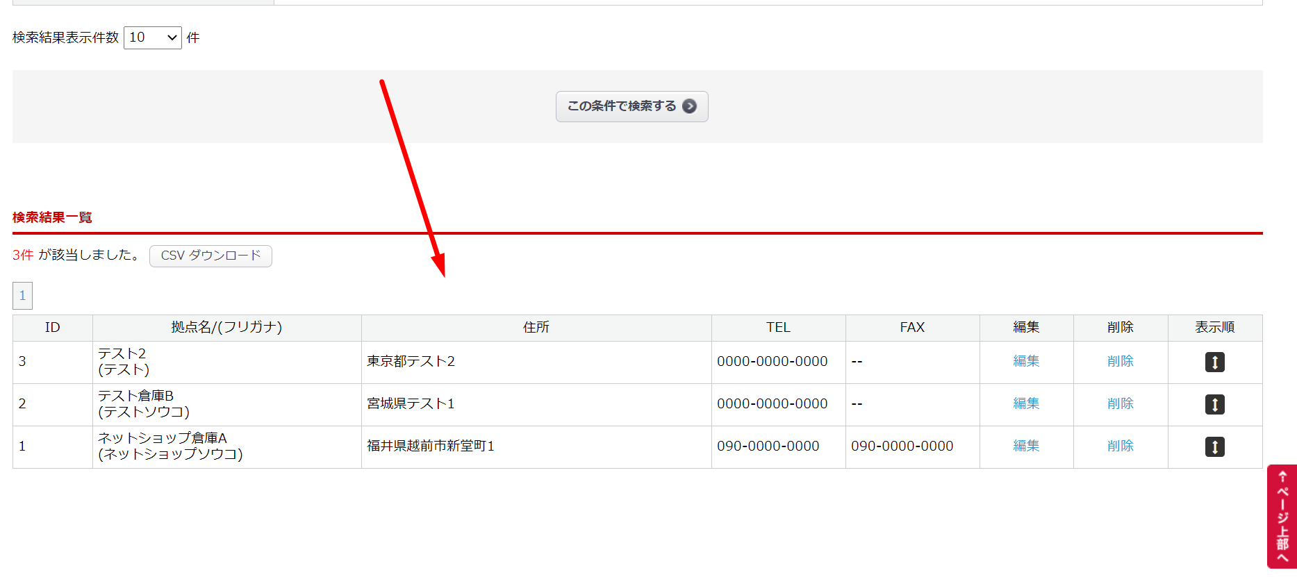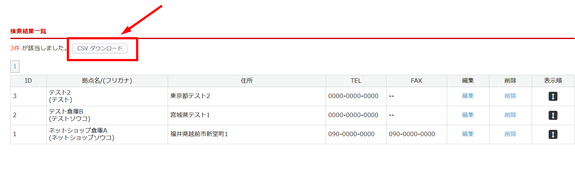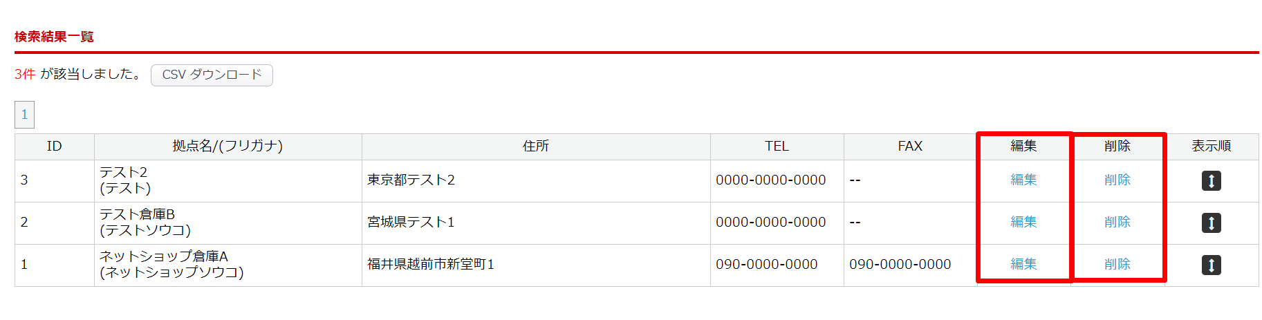 登録した拠点情報は、 検索結果一覧の「編集」をクリックすることで確認できます。