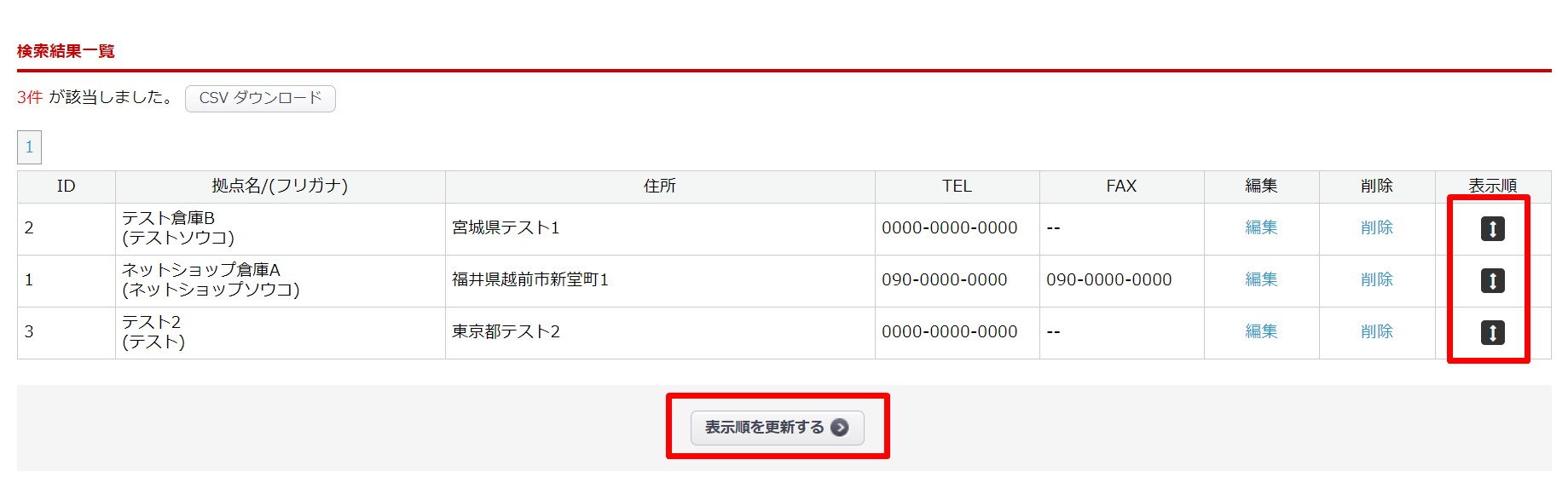 拠点情報の表示順更新