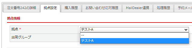 登録した拠点は、受注データ内「拠点設定」タブ>拠点情報の「拠点」選択肢として表示されます。
