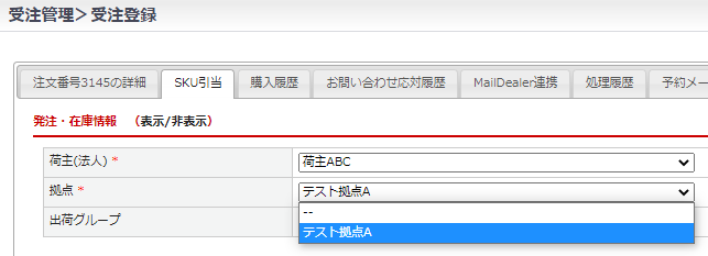 ※在庫管理オプションご利用時は「SKU引当」タブ 「発注・在庫情報」の「拠点」として表示されます。