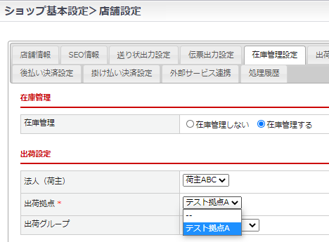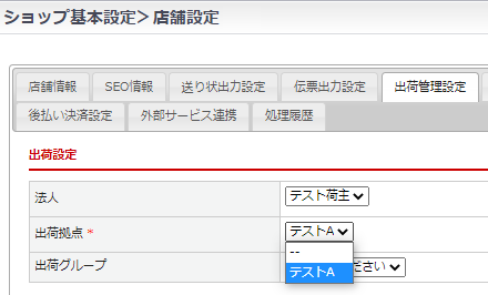 基本設定>店舗設定>「出荷管理設定」タブにて出荷設定の「出荷拠点」を選択すると、