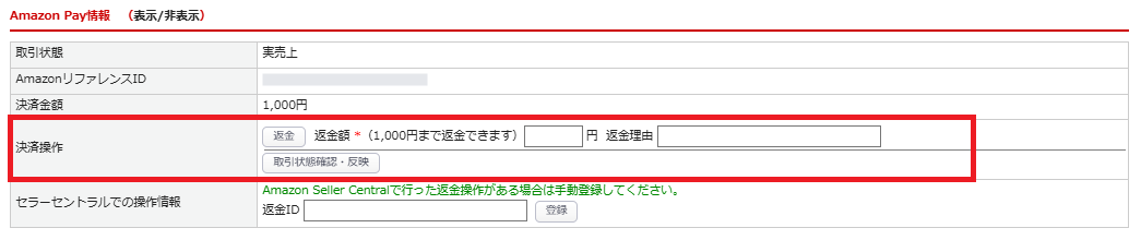 受注管理>受注一覧にて該当の受注詳細にて、「Amazon Pay情報」にある返金額と返金理由を入力して