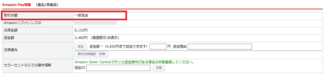 返金額によって、取引状態が「全額返金」「一部返金」と表示されます。