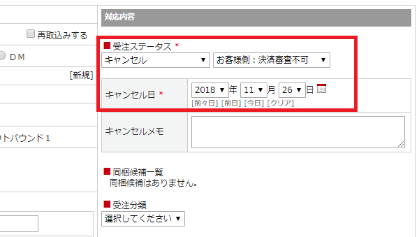受注詳細の受注ステータスをキャンセルに変更し、登録するボタンを押下
