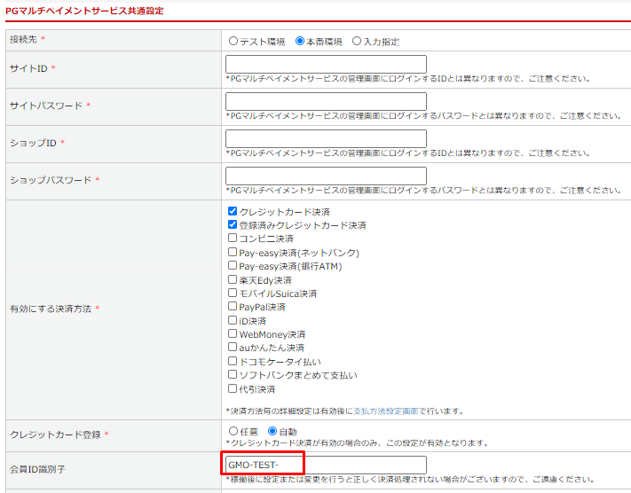 会員ID識別子に接頭辞となるお好きな半角英数字を入力します。(例として「GMO-TEST-」)