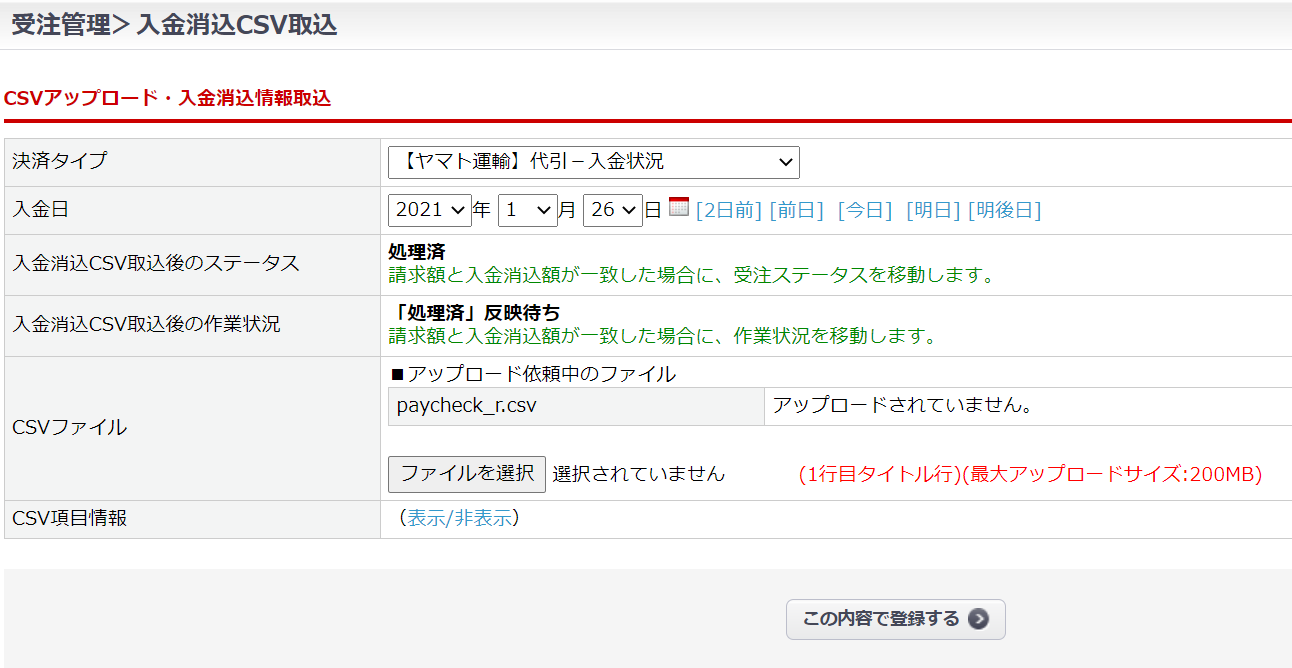 2.「受注>入金消込CSV取込」画面を開き、
