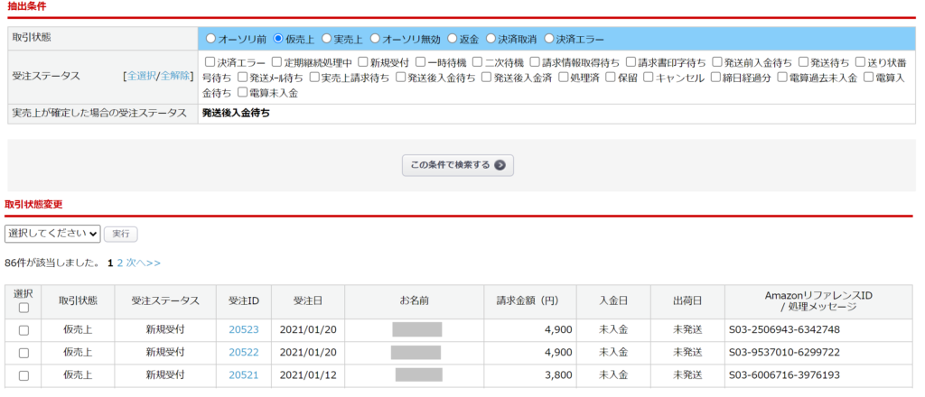 1.受注>Amazon Pay取引状況管理 を開きます。