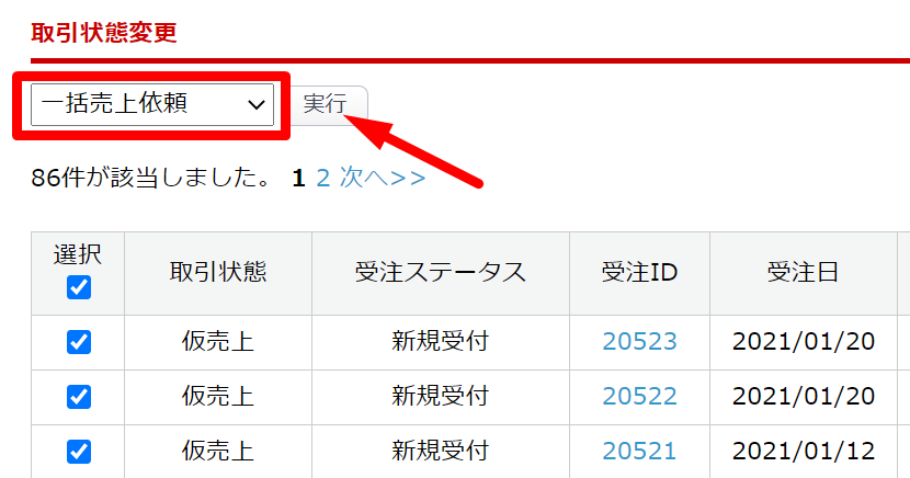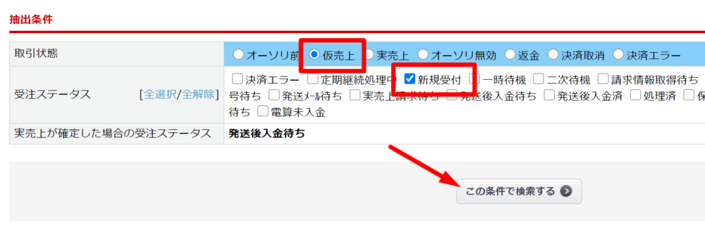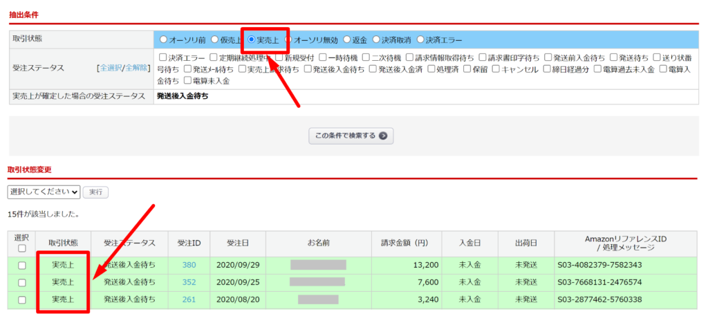 例)今回は決済状況「実売上」で再抽出することで一括売上依頼後の受注を確認出来ます。