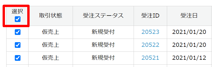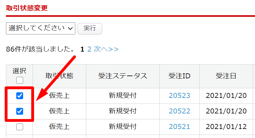 3.抽出された受注の中で処理の対象とするものにチェックを入れます。