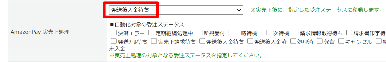 基本設定>管理システム設定>業務フロー設定>■8.売上請求業務>Amazon Pay 実売上処理」欄