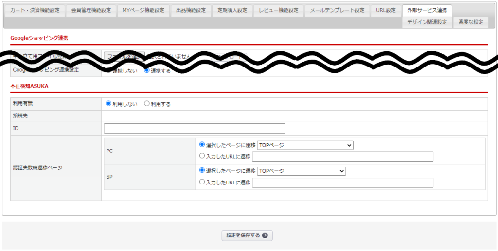 基本設定>カートシステム設定>「外部サービス連携」タブ
