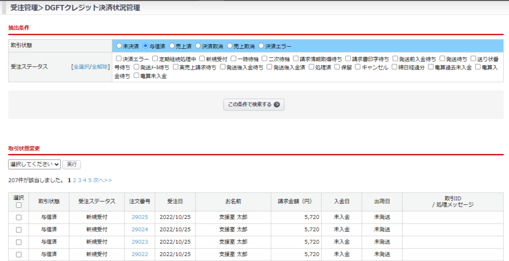 DGFTクレジット決済を利用した受注の決済状況を一覧で確認する画面です。