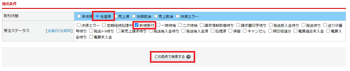 2.抽出条件「取引状態」「受注ステータス」を設定後、