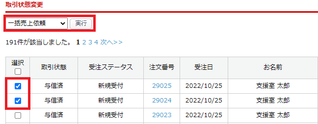 4.対象受注に対して行う処理の種類をプルダウンより選び、【実行】をクリックします。
