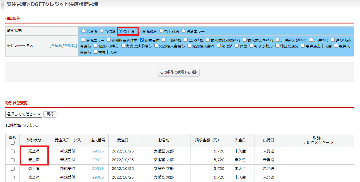1.受注>DGFTクレジット決済状況管理 を開きます。