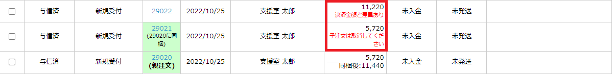 決済金額と請求額に相違がある受注データや、取消前の子注文の場合、
