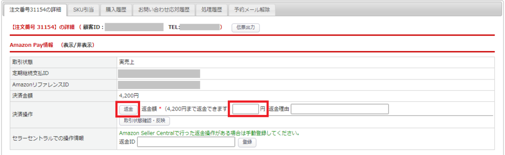 「返金額」を入力し、【返金】ボタンをクリックすることで返金処理ができます。