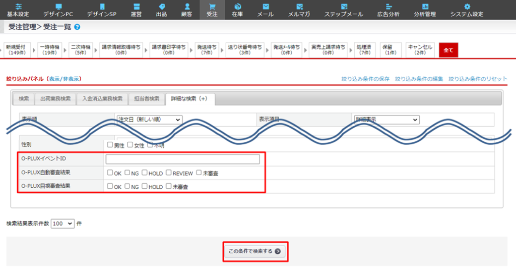 受注一覧を開き、絞り込みパネルよりO-PLUXの審査結果を条件に設定します。