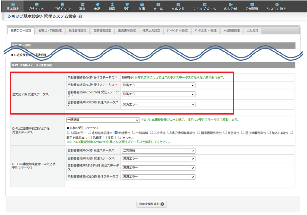O-PLUXの審査結果に応じて、注文完了後の受注ステータスを自動的に設定することが可能です。