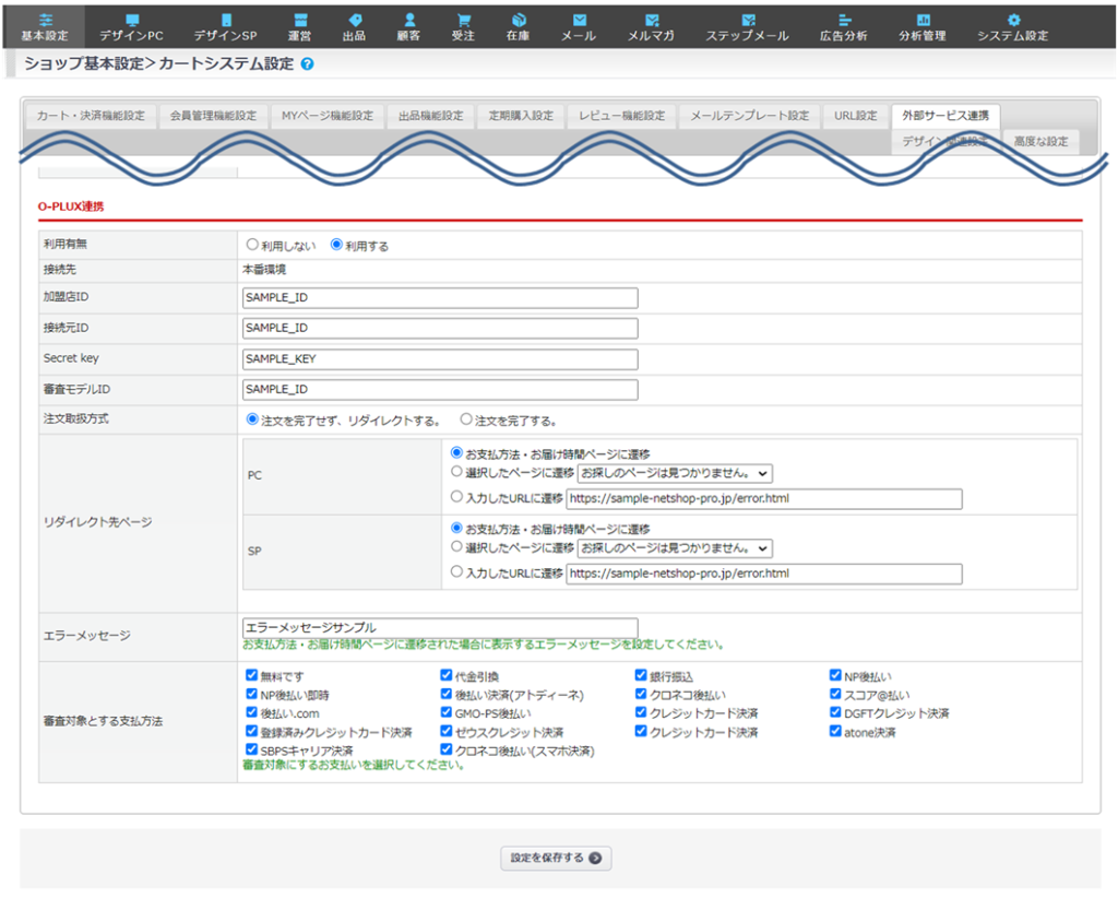 基本設定>カートシステム設定>[外部サービス連携]タブ