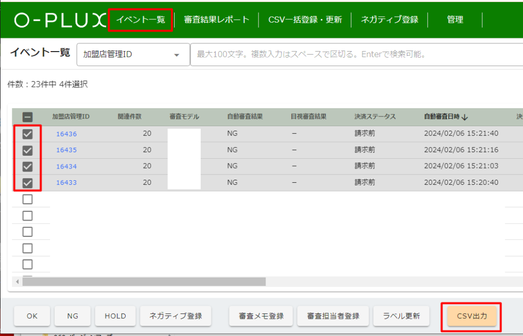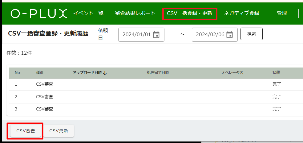 CSVダウンロード後に、O-PLUXにログインし、CSV審査を行います。