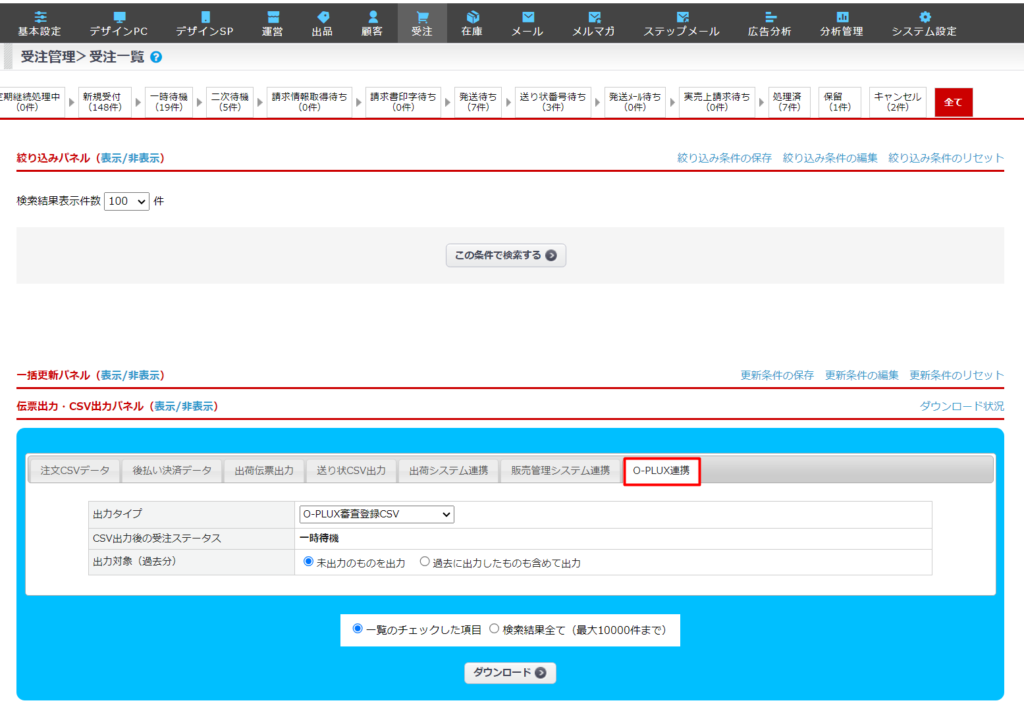 受注管理>受注一覧>伝票出力・CSV出力パネル>[O-PLUX連携]タブ