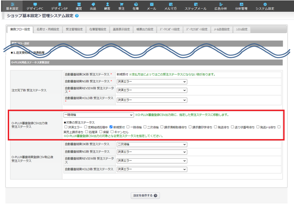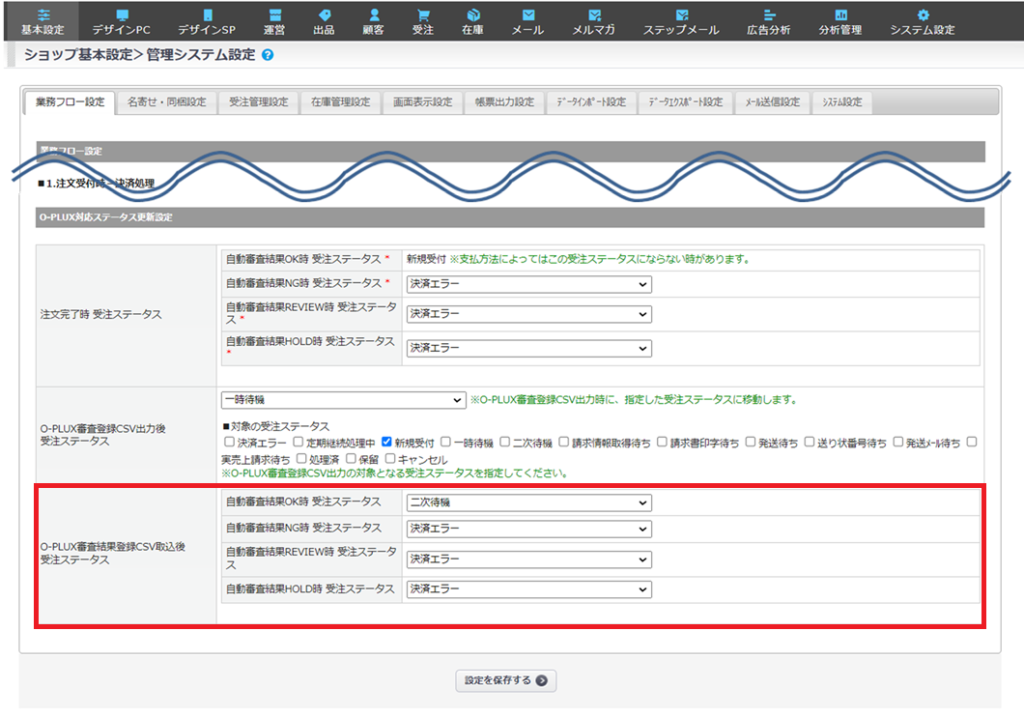 ※「O-PLUX審査結果登録CSV取込後のステータス」設定についてはこちらで設定可能です。