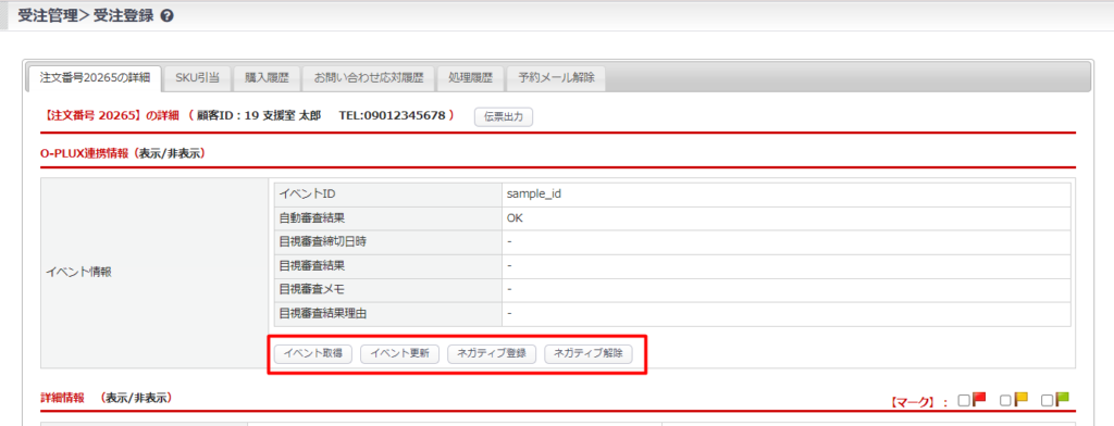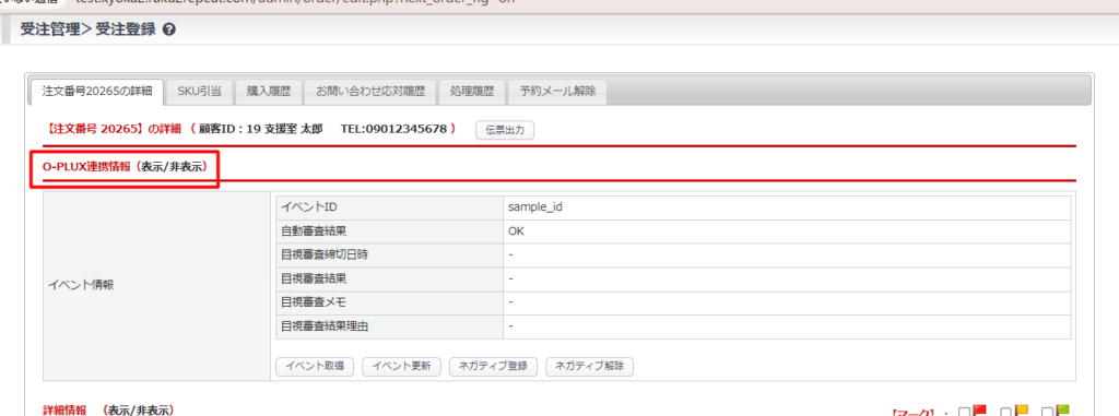 審査結果を取り込んだ受注は、O-PLUXに自動連携された受注と同様に、受注登録画面の上部にO-PLUX連携情報が表示されます。