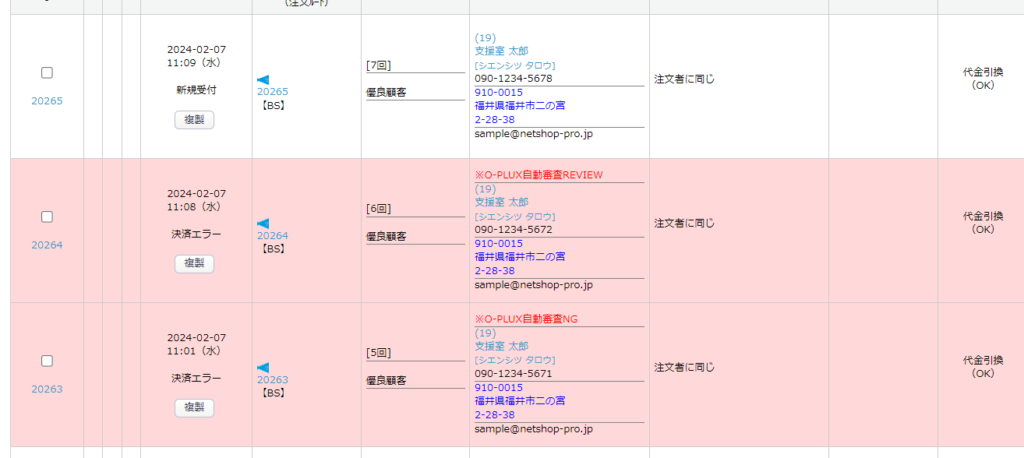 NG受注一覧の「注文者氏名」の上部に、「※O-PLUX自動審査NG」と表示されます。