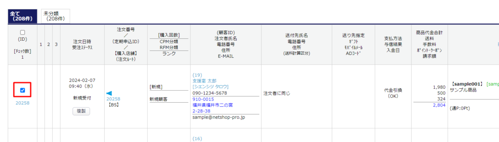 スマレジEC・リピートの管理画面より受注一覧画面を開き、審査を行いたい受注をチェックします。