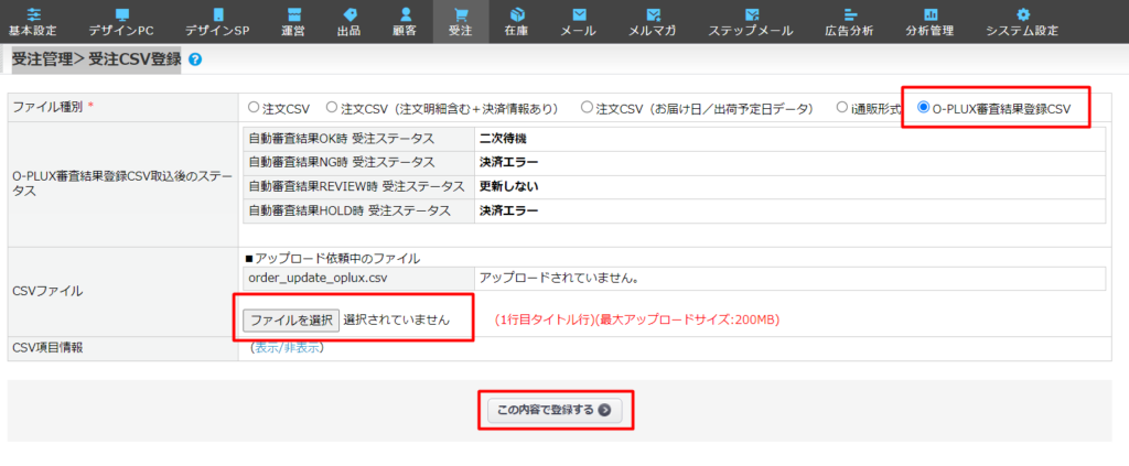 O-PLUX審査結果登録CSVアップロード後の受注ステータスを自動的に変更する方法