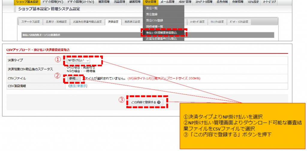 受注管理>後払い決済審査結果取込 より審査結果の取込みが可能です。