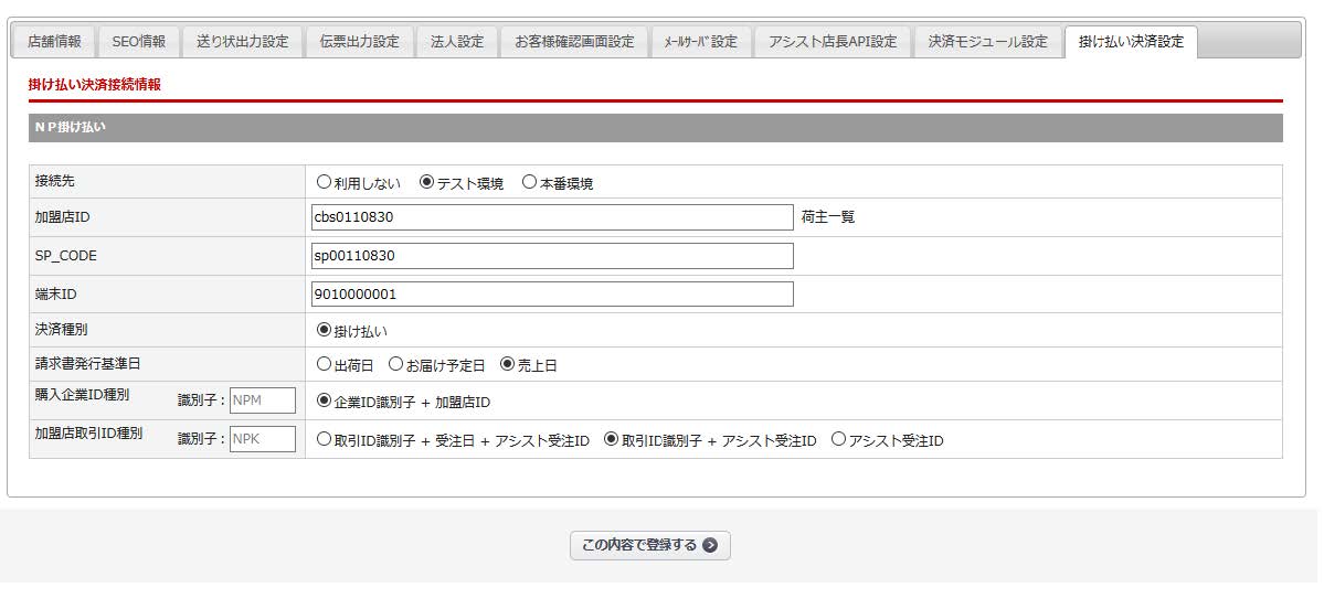 | SP_CODE | NPよりは発行されるコードをご設定ください | 加盟店取引ID種別 | スマレジEC・B2B側で採番されている注文番号としてNP掛け払いに連携するIDの採 番ルールを指定します |