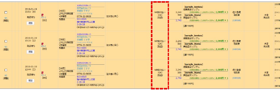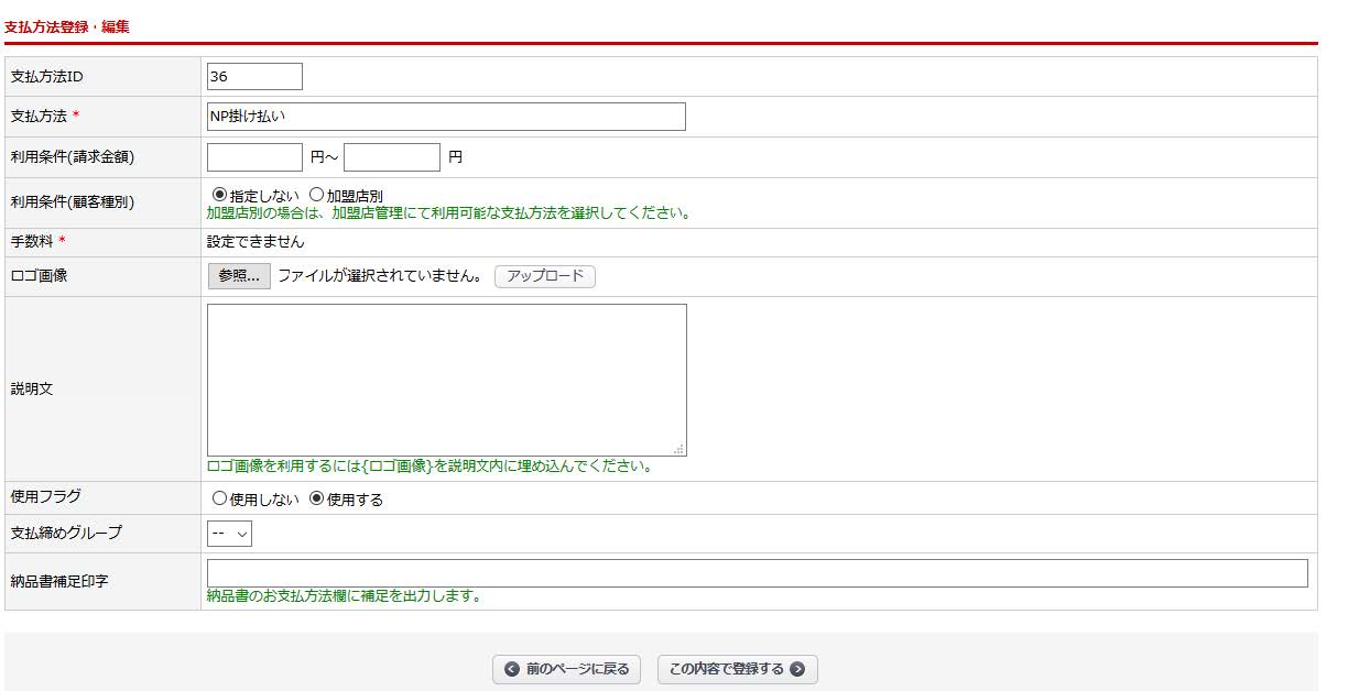 | 手数料 | 設定できません※NPの規約により設定不可 | 納品書補足印字 | 納品書のお支払方法欄に補足として登録文言を出力します |