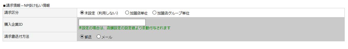 | 加盟店ID | NPより発行される加盟店 ID をご設定ください | 購入企業ID種別 | 自動採番される企業IDの採 番ルールを指定します ※購入企業 ID 毎に請求がまとまります |